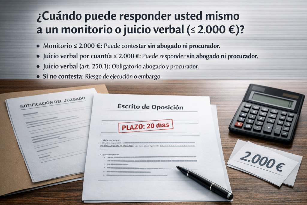 Si le reclaman una deuda de hasta 2.000 €, en muchos casos puede contestar usted mismo al juzgado: monitorio y juicio verbal por cuantía. Le explicamos cuándo es posible, para qué sirve responder (casos típicos) y cómo presentar el escrito a tiempo para evitar ejecución y embargo.